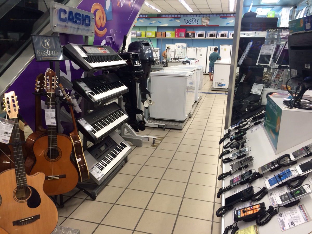 Der Stadt sieht man ja schon an, das sie mal viel Geld hatte. Im Stadtkern stehen schöne alte Häuse rund um das Theater. Das ist aber laut Reisefüher auch schon die einzige Sehenswürdigkeit, so das wir auch nur auf dem Platz davor in einem Restaurant gegessen haben. Vorher sind wir noch eine Runde durch die Strassen gegangen und ich konnte endlich mein Problem lösen. Nachdem meine Uhr wegen Batteriemangel schon in Curitiba stehengeblieben ist, war ich auf der Suche nach einer günstigen Digitaluhr. Nachdem es überall nur relativ teuer oder groß und klumpig gab habe ich hier in einer Art Media Markt das Uhrenregal gefunden. Neben akustischen Gitarren, Keyboards und Aussenbordmotoren findet man selbstverständlich auch Handys und Casio Uhren.