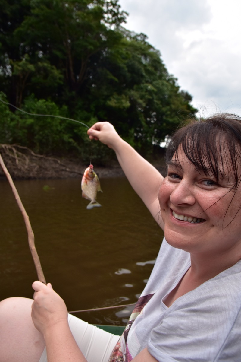 Sehr spannend, aber kein Sport für mich. Ich habe die Viecher eher gefüttert, als dass sie mir an den Haken gingen – davon Leben könnten wir also nicht. Trotzdem eine witzige Angelegenheit. Ein Rohrstock mit einer Nylon-Schnur und Haken dran. Daran wird dann ein kleines Stück rohes Beef aufgesteckt und ins Wasser gehängt, noch etwas mit dem Rohrstock das Wasser aufpeitschen und warten. Lange dauert es aber nicht, bis etwas an der Schnur zuppelt und dann bleibt hoffentlich ein Fisch dran hängen. Nachdem mir ein Piranha zwei mal vom Haken gesprungen ist, hatte ich von mind. 15 Versuchen zum Schluss doch einen an der Angel, aber der durfte dann weiterschwimmen, weil er zu klein war. Naja, Marco hatte zum Glück eine größere Ausbeute, so dass wir uns unser Abendessen verdient hatten – auch wenn es keinen Fisch gab.