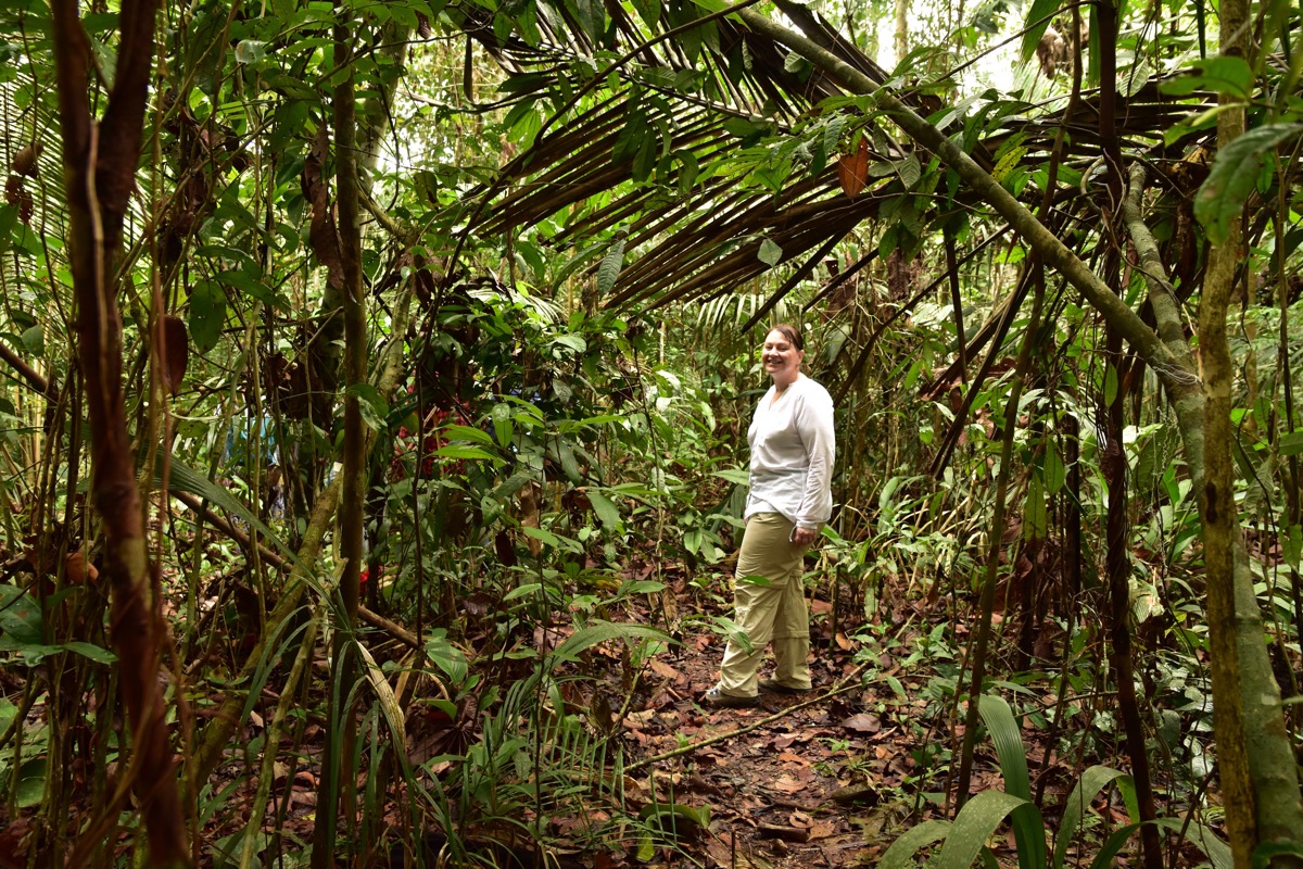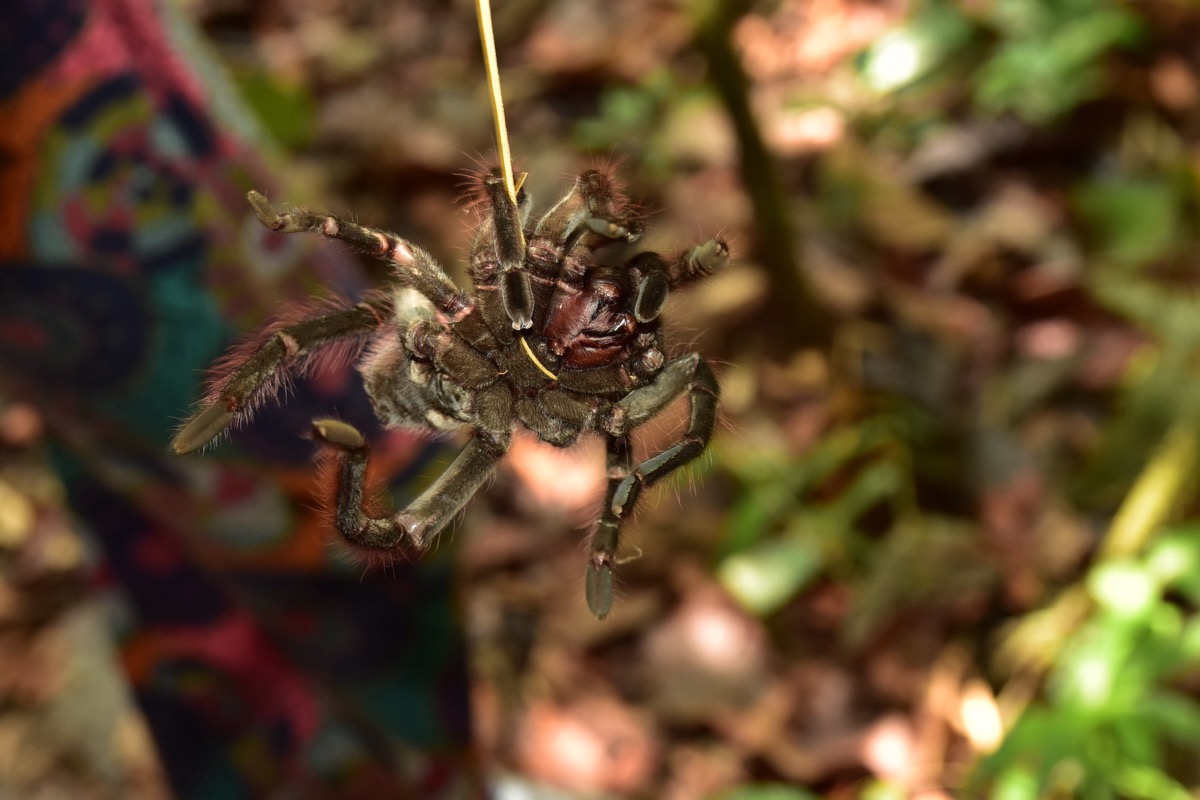 Heute morgen war die Ansage: Lange Klamotten und Wanderschuhe – es geht in den Urwald. Wir sind ca 4h über fast unsichtbare Wege durch den sekundären und primären Wald gelaufen. Nahe des Flusses sind die Bäume noch kleiner weil alles immer mal wieder überflutet wird. An den Bäumen kann man sehen, wie hoch das Wasser in der Regenzeit steigt.Dann geht es weiter in den primären Wald – hier wird der Boden nicht überflutet und alles sieht anders aus. Vereinzelt riesige Bäume, wilde Bananen (da ist natürlich ein Zaun drum, damit sie nicht angreifen), Palmen und allerlei grünes Gestrüpp unterschiedlichster Art (die Biologen unter den Lesern mögen mit verzeihen). Der Guide kennt sich wirklich aus, erklärt alles mögliche und bastelt eine Schlinge aus einer Pflanzenfaser um eine Vogelspinne zu fangen und anschliessend unversehrt wieder freizulassen.