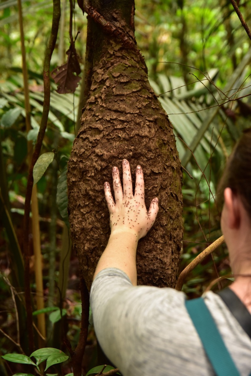 Wir lernen wie man mit ein paar zerriebenen Ameisen ein wirksames Mittel gegen Mücken einfach so wie am Selbstbedienungsspender findet oder aus einer Wasserliane sein Trinkwasser bezieht. Letzteres wird nicht ausprobiert, weil die Liane dabei kaputt geht und wir sind ja hier auf einer Ökolodge da wird nicht sinnlos zerstört. Das beim Zerreiben einige tausend Miniameisen zu einem Djungeldeo auf der Haut zerrieben werden sollte der Ameisenstaat verkraften. Und den Vorteil des Naturproduktes mit Anti Mückenwirkung erkauft man sich mit einem sehr natürlichen Duft. Man riecht ziemlich nach Ameisenmatsche und Wald. So passt man sich voll und ganz der Umgebung an. Jäger tun das auch um von den Tieren nicht gewittert zu werden. Ob sie vor dem Heimkommen im Amazonas baden damit die Frau sie überhaupt wieder ins Haus lässt wurde nicht weiter erörtert.
